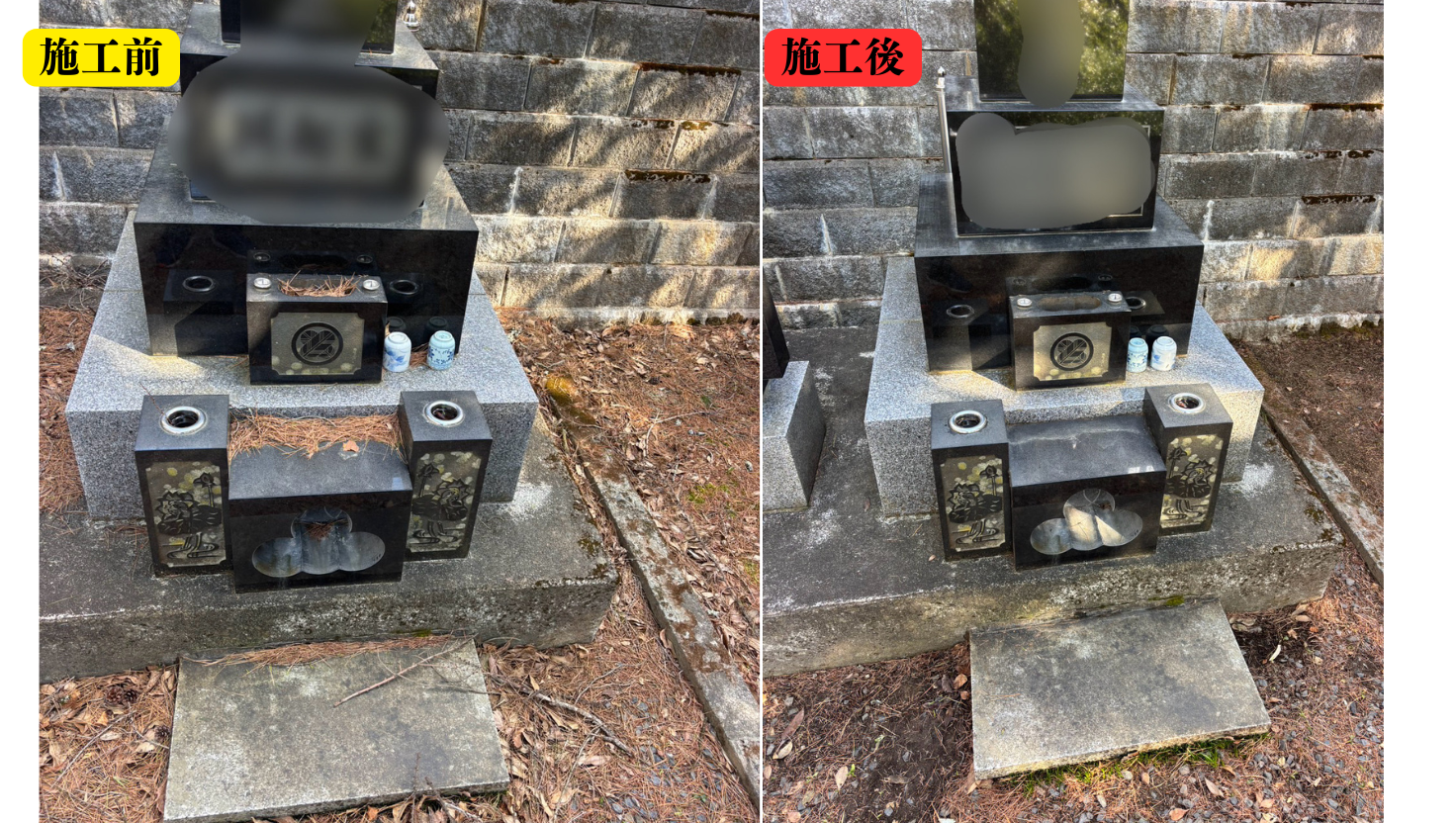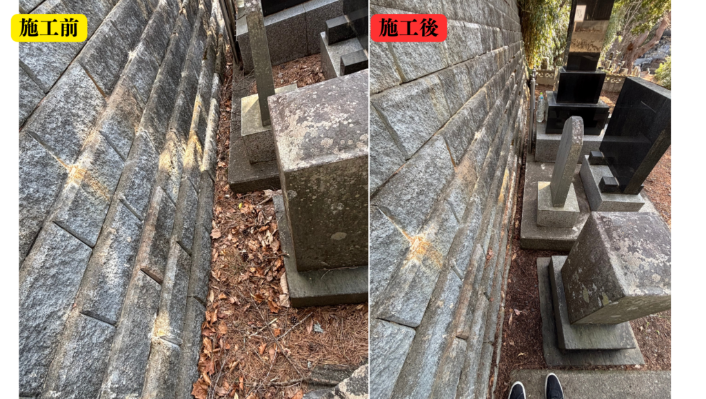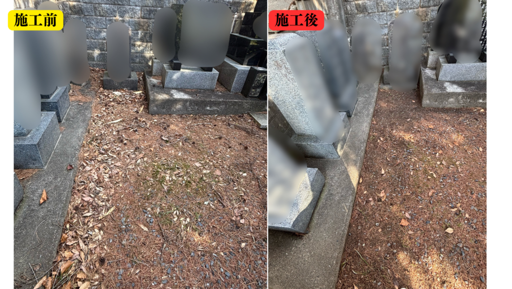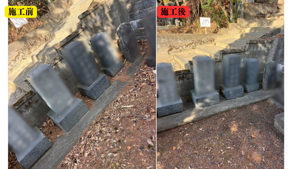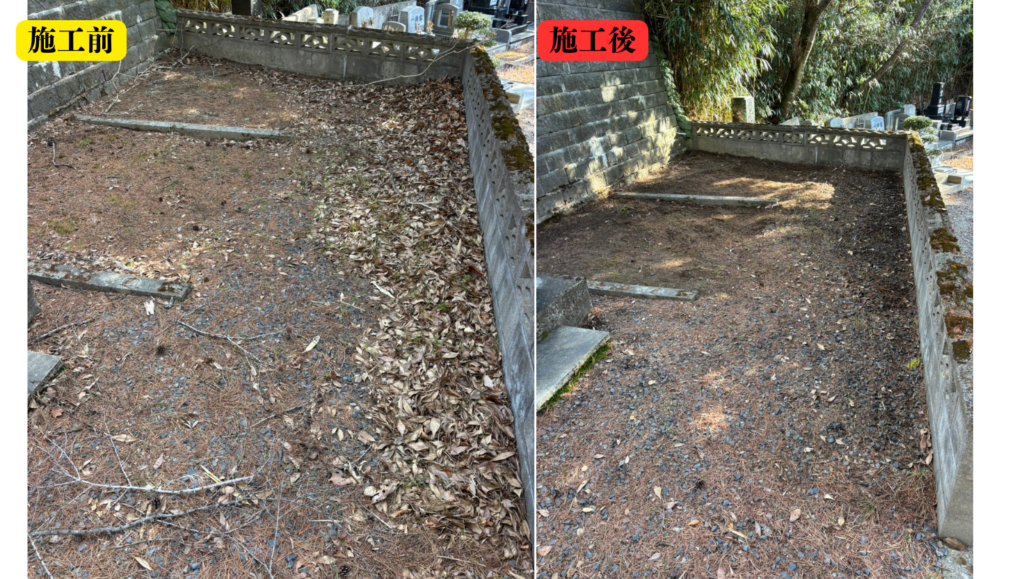 今回の施工では、墓石の周りや隙間に入り込んだ枯れ葉を一つひとつ丁寧に取り除き、すっきりとした状態に整えました。