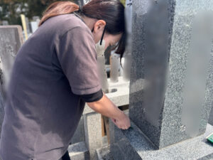 石塔・外柵・墓誌を専用洗剤で丁寧に清掃し、草むしりやゴミの片付けも行います。